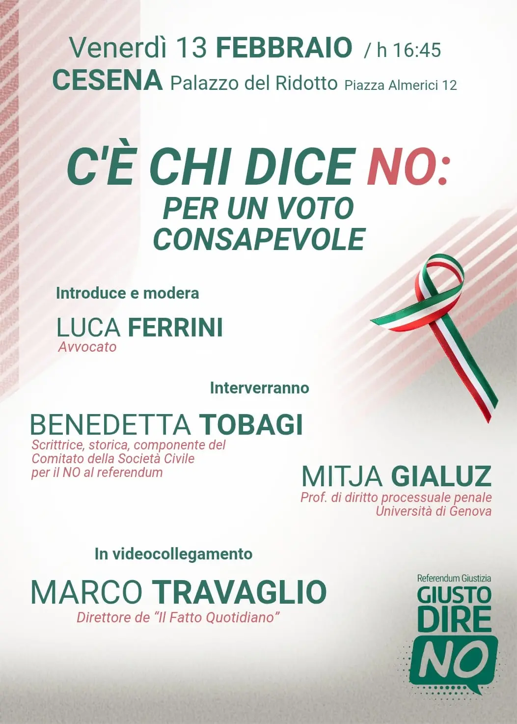 Che il voto per il referendum del 22 e 23 marzo sia consapevole, frutto di informazione, formazione, approfondimento e scelta è fondamentale. Occorre informarsi e confrontarsi. Ottima occasione quella di Cesena: a spiegare le buone ragioni del No saranno: l’avvocato Luca Ferrini; Benedetta Tobagi, scrittrice e storica componente il Consiglio Direttivo del Comitato Società Civile per il No; Mitja Giluc, Università di Genova e in collegamento il giornalista Marco Travaglio