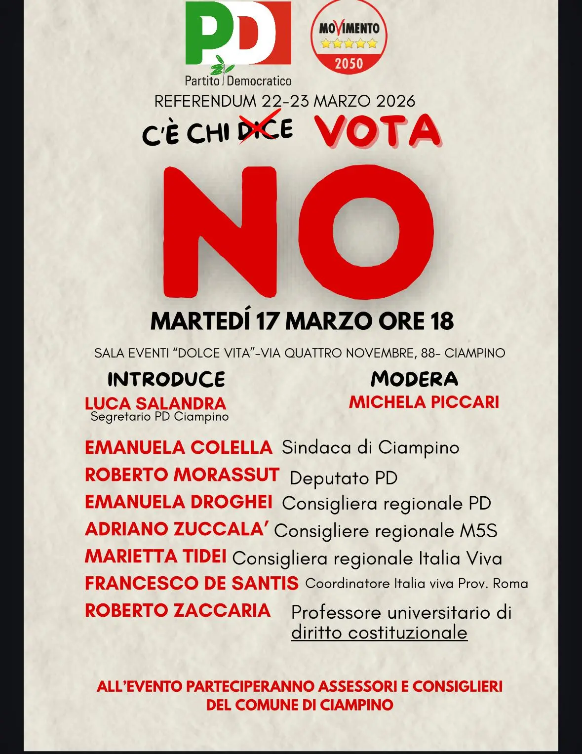 Appuntamento istituzioale quello di Cimpino. Parteciperanno, infatti, il sindaco, un parlamentare e numerosi consiglieri comunali e regionali per affermare un forte No al referendum del 22 e 23 marzo sulla riforma Nordio. Con loro Roberto Zaccaria docente di Diritto costituzionale