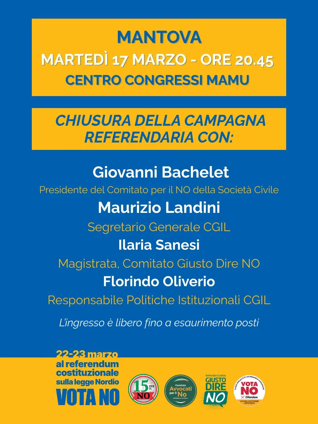 Giovanni Bachelt, presidente del Comitato Società Civile per il No; Maurizio Landini, segretario generale della Cgil, Ilaria Senesi, magistrata; Florindo Oliverio, responsabile riforme istituzionali della Cgil; chiuderanno insieme la campagna elettorale di Mantova