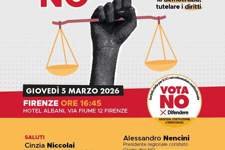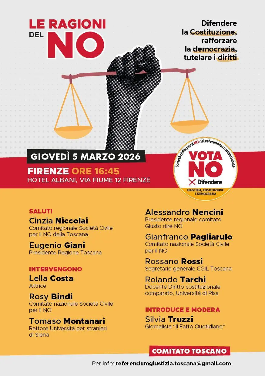 Denso e intenso pomeriggio fiorentino quello previsto il 5 marzo per illustrare le ragioni del No al referendum del 22 e 23 marzo sulla riforma Nordio. interverranno, tra gli altri: Lella Costa, attrice; Rosy Bindi, Comitato Società Civile per il No; Tomaso Montanari, Rettore Università per stranieri di Pisa; Alessandro Nencini, Comitato regionale per il No; Gianfranco Pagliarulo, presidenti dell’Anpi; Rossano Rossi, segretario generale Cgil Toscana; Rolando Tarchi, docente di diritto comparato università di Pisa