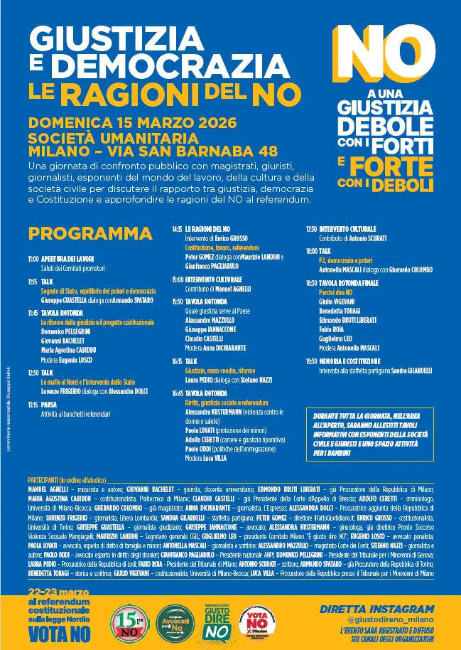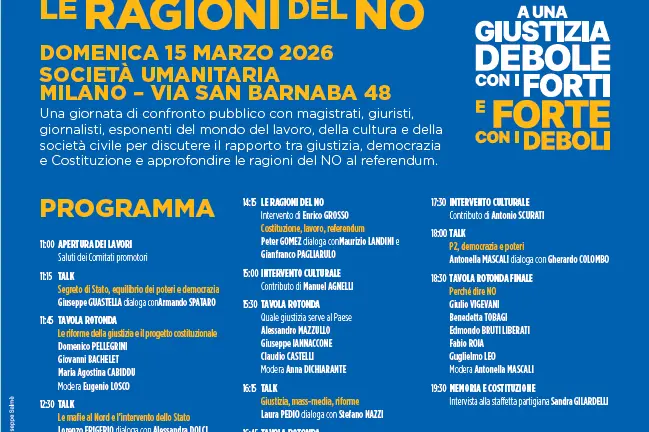Davvero tantissime le presenza in questa lunga domenica di riflessione sulle ragioni del No al referendum sulla riforma Nordio che si celebrerà il 22 e 23 marzo prossimo. In gioco c’è la giustizia e la democrazia. tra gli altri: Giovanni Bachelet, presidente del Comitato Società Civile per il No; Maurizio Landini, segretario generale della Cgil; Armando Spataro, già magistrato; Gianfranco Pagliarulo, presidente Anpi; Benedetta Tobagi, storica e scrittrice; Edmondo Bruti Liberati, già procuratore della Repubblica di Milano