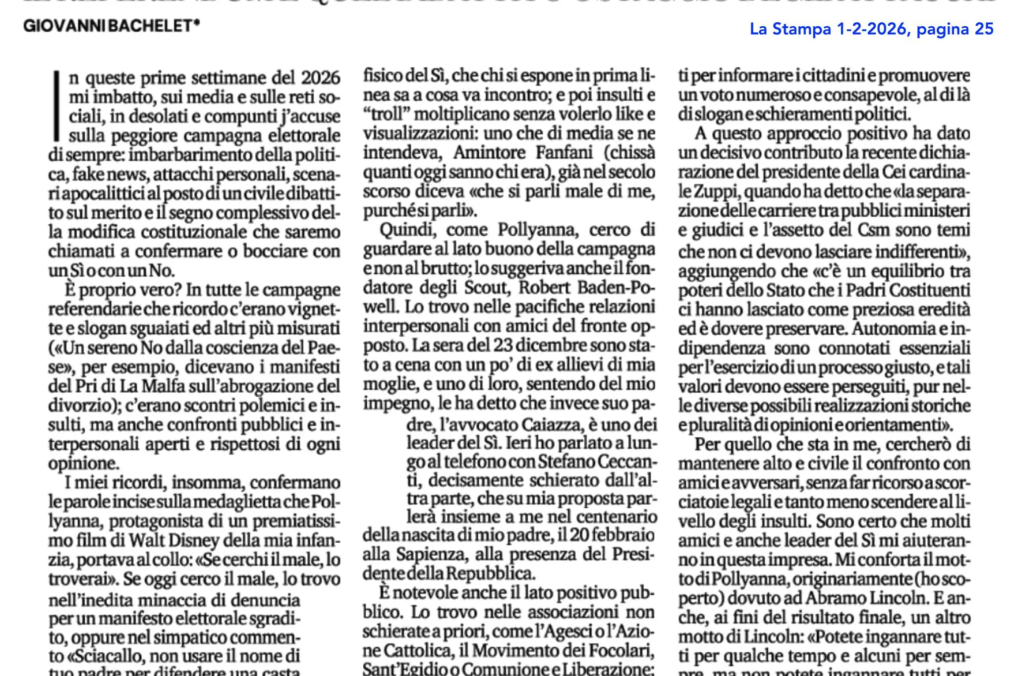 La letteraIL referendum e quel dibattito ostaggio degli attacchiGiovanni Bachelet, presidente del Comitato Società Civile per il No, ha scritto una lettera al direttore de La Stampa 4 febbraio 2026 • 10:17Tag:materialiPHOTO