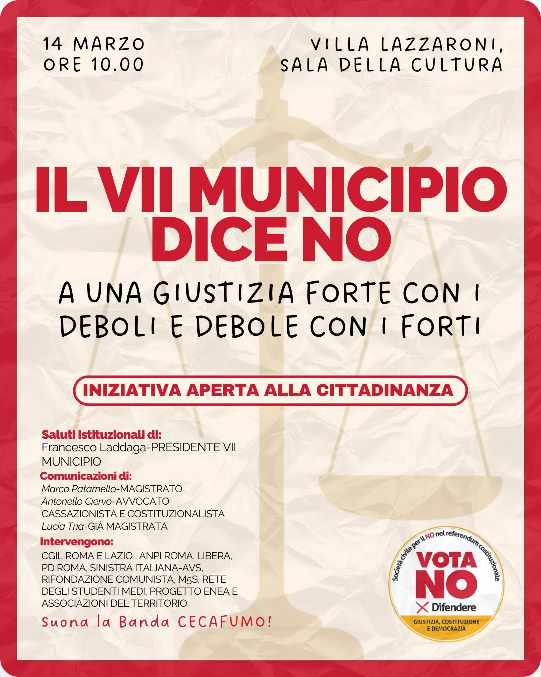 Iniziativa pubblica con il presidente del VII Municipio, Francesco Laddaga, il magistrato Marco Patarnello; l’avvocato cassazionista Antonello Cierno, la già magistrata Lucia Tria. Si parlerà del perché votare No al referendum del prossimo 22 e 23 marzo.