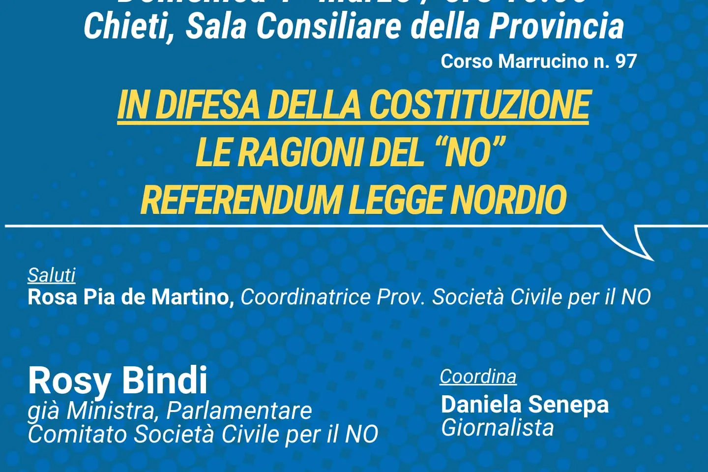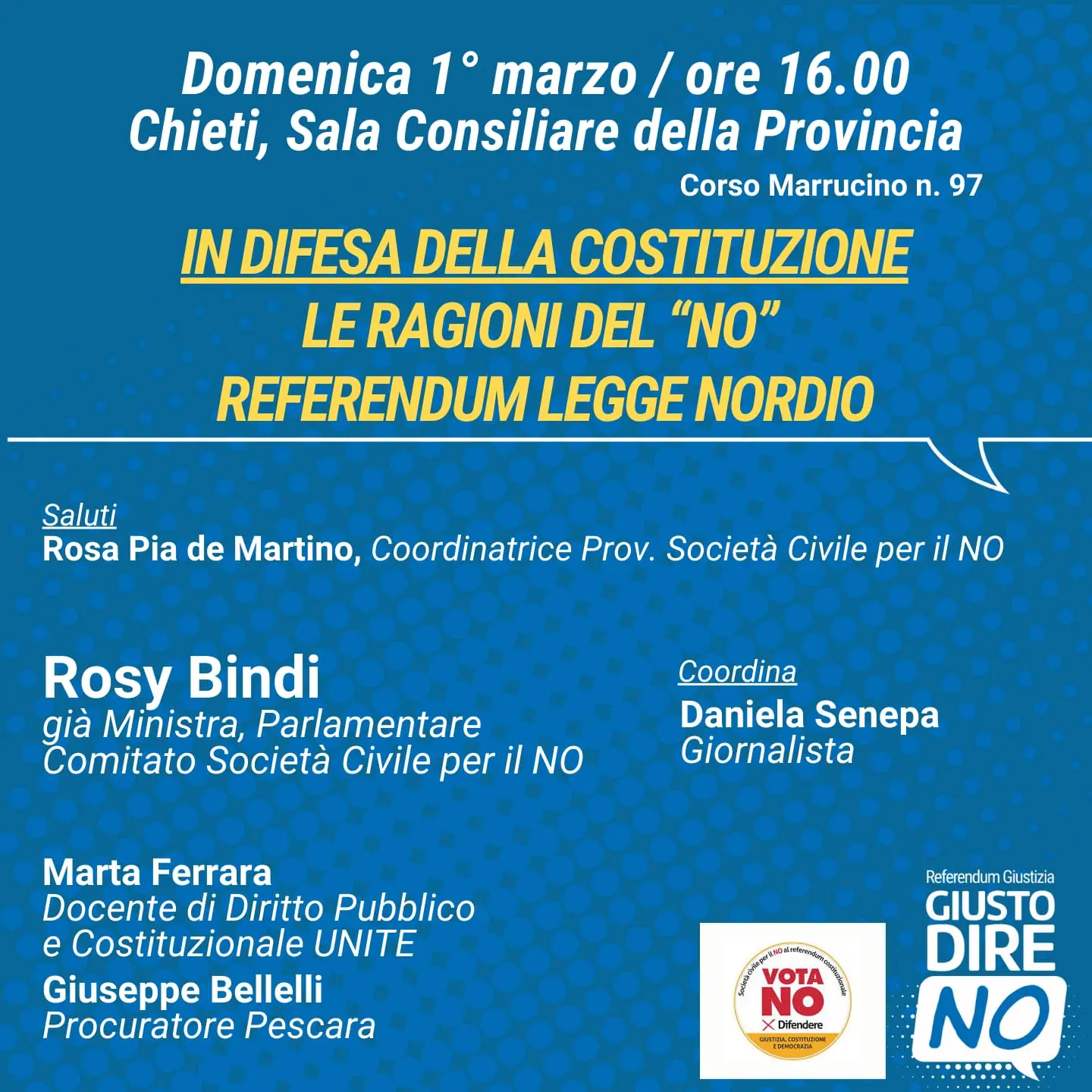 Seconda tappa abruzzese nella domenica 1 marzo per Rosy Bindi, Comitato Società Civile per il No, che incontrerà gli elettori e le elettrici a Chieti per illustrare le ragioni del No al referendum del 22 e 23 marzo sulla riforma Nordio