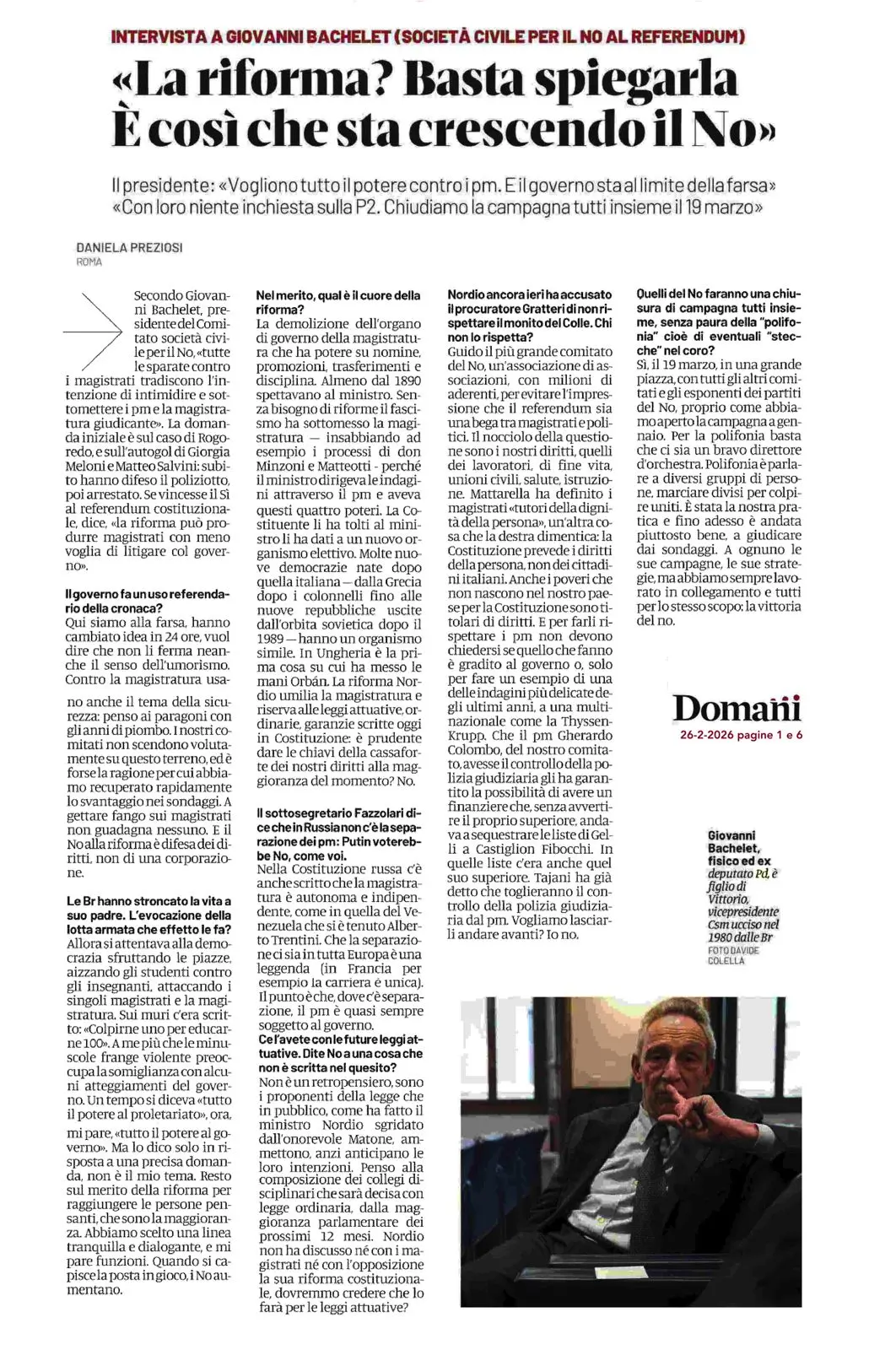 L’intervistaLa riforma? Basta spiegarla E’ così che sta crescendo il NoFutura srlIntervista di Daniele preziosi “Il Domani” a Giovanni Bachelet, presidente Comitato Società Civile per il No 1 marzo 2026 • 18:30Tag:materialiPHOTOFutura srl