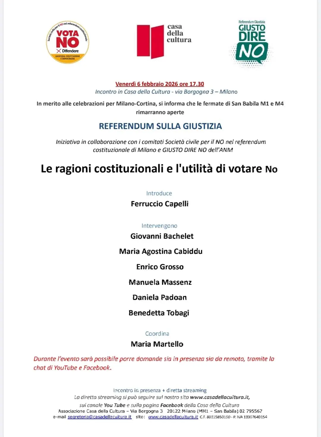 Appuntamento organizzato dalla Casa della Cultura di Milano insieme ai comitato Società Civile per il No e GiustoDireNo per indagare le ragioni costituzionali che fanno ritenere fuori dalla Coastituzione la Riforma Nordio.