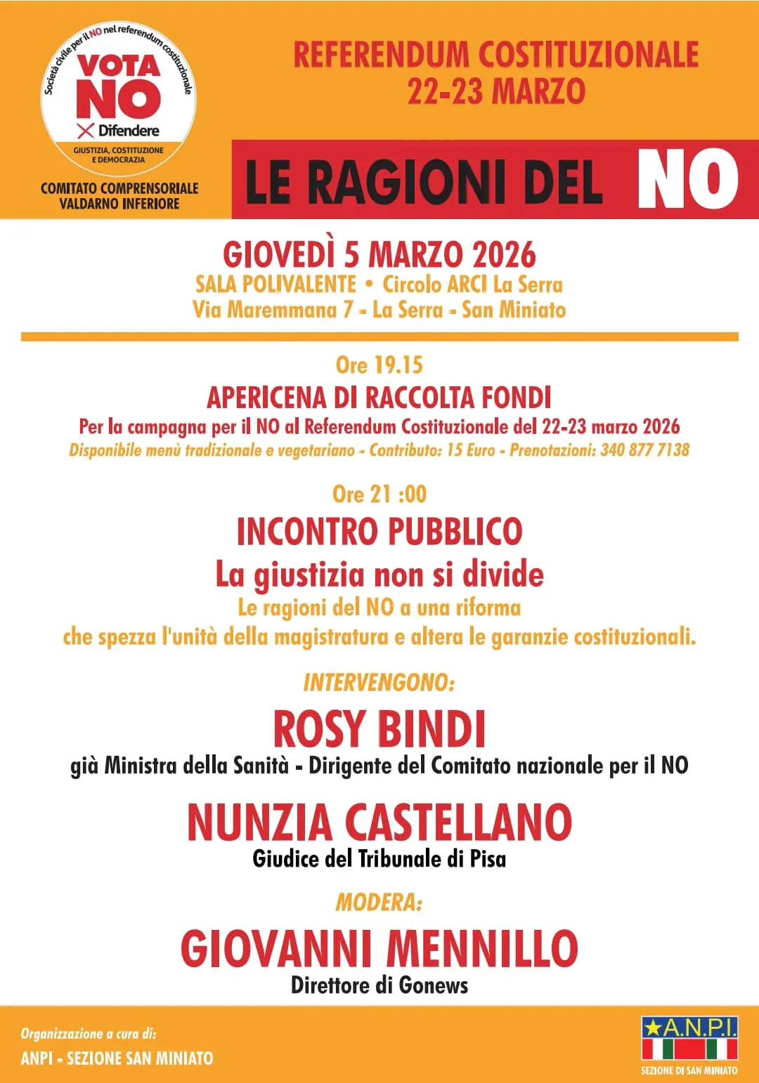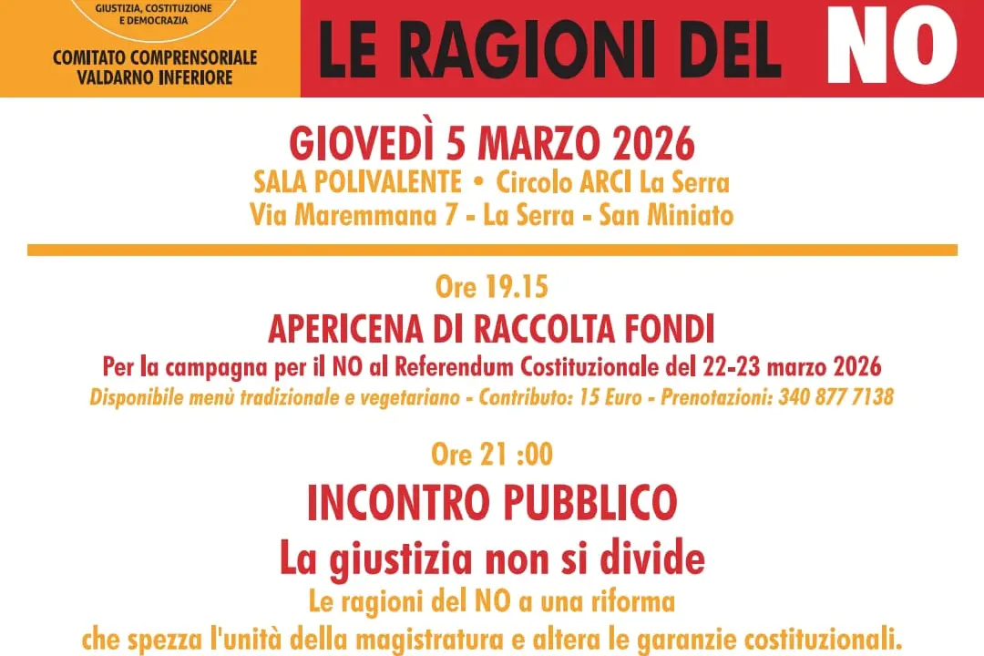 Dopo un apericena di raccolta fondi, alle 21.00 si terrà un ioncontro pubblico per illustrare le ragioni del No al referendum del 22 e 23 marzo sulla riforma Nordio. Con Rosy Bindi, Comitato Società Civile per il No; Nunzia Castellano, giudice del Tribunale di Pisa; Giovanni Mennillo, direttore Gonews