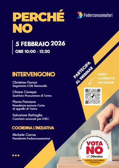 La Federconsumatori organizza mercoledì 5 febbraio un webinar sul perché votare No il prossimo 22 e 23 marzo.