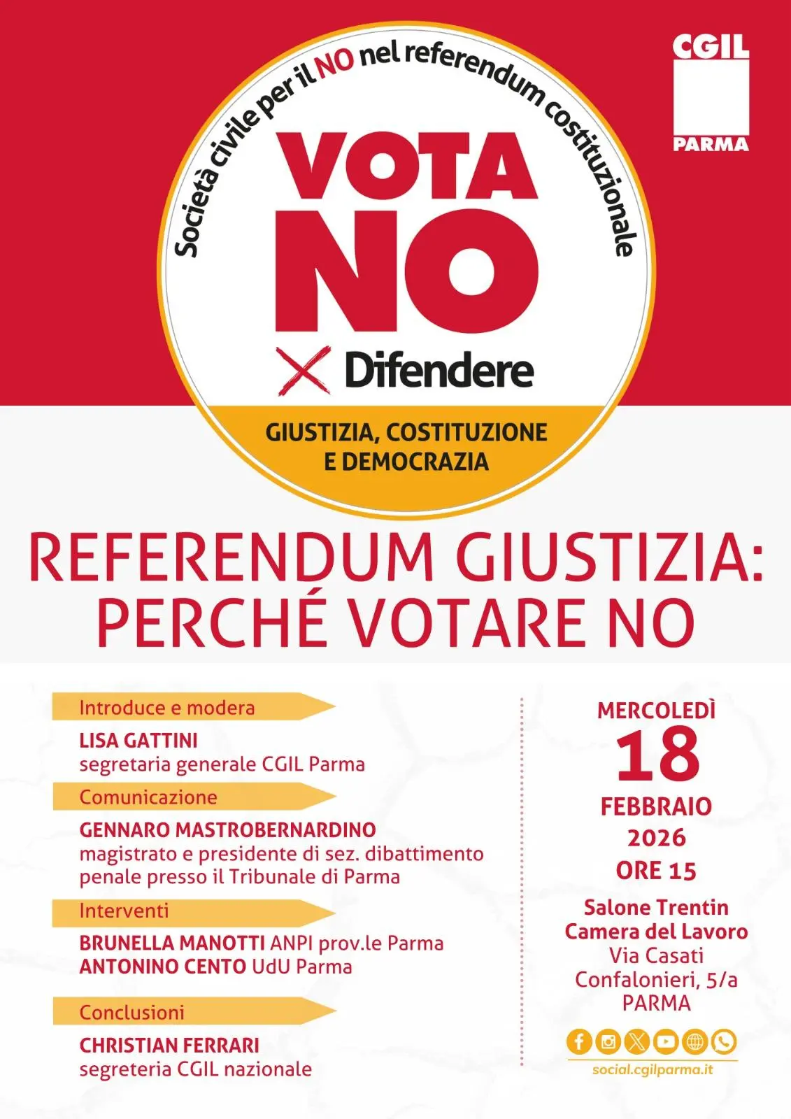 Nel salone della Camera del Lavoro di Parma si riunisce la Società Civile per ragionare del No al Referendum costituzionale del 22 e 23 marzo prossimo sulla Riforma Nordio. Dall’Anpi alla Cgil, dall’Udu a esponenti della magistratura. tra gli altri inteverrà Christian Ferrari, segretario nazionale della Cgil e compionente il Direttivo del Comitato Società Civile per il No