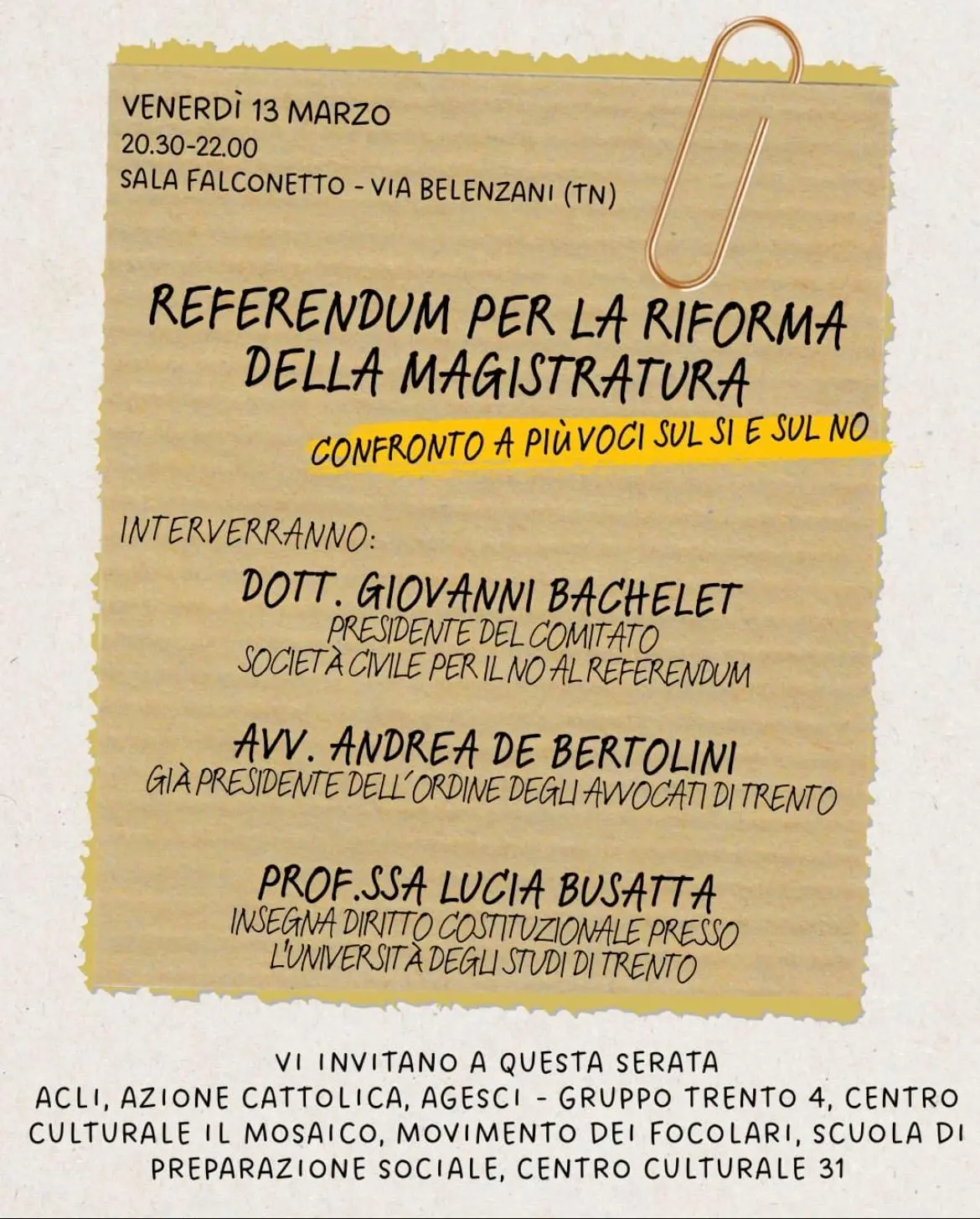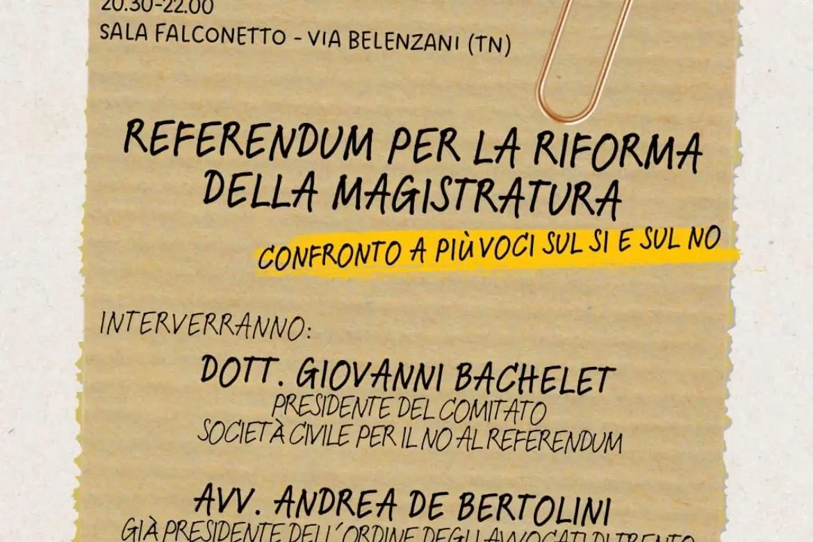 Le ragioni del Si e quelle del No al referendum costituzione del 22 e 23 marzo sulla riforma della magistratura saranno protagoniste della serata trentina. Per il No Giovanni Bachelet, presidente del Comitato Società Civile per il No