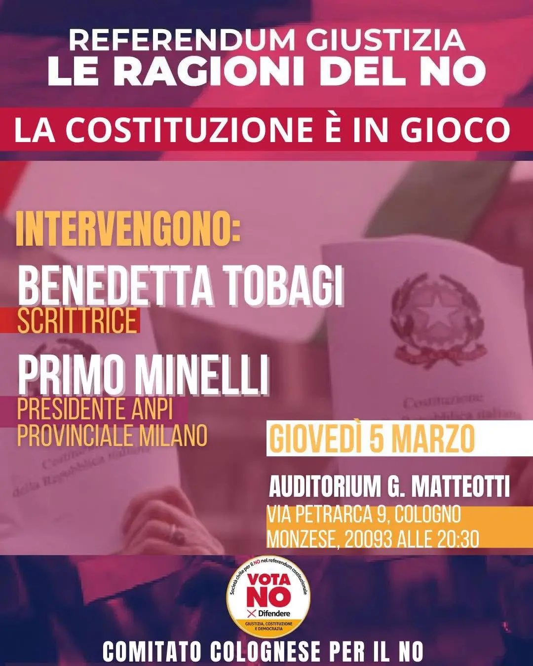 Le raggioni del No al referendum del 22 e 23 marzo sulla riforma Nordio illustrate da Benedetta Tobagi, storica e scrittrice, e Primo Minelli, presidente Anpi provincia Milano