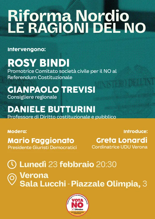 Sarà Greta Lonardi, portavoce regionale dell'Udu a introdurre l’iniziativa che si terrà a Verona nella Sala Lucchi alle ore 20.30. Tra i partecipanti Rosy Bindi, del Consiglio Direttivo del Comitato Società Civile per il No al referendum del 22 e 23 marzo sulla Riforma Nordio