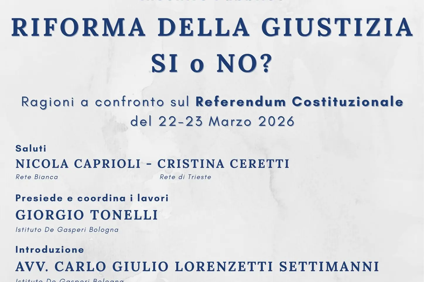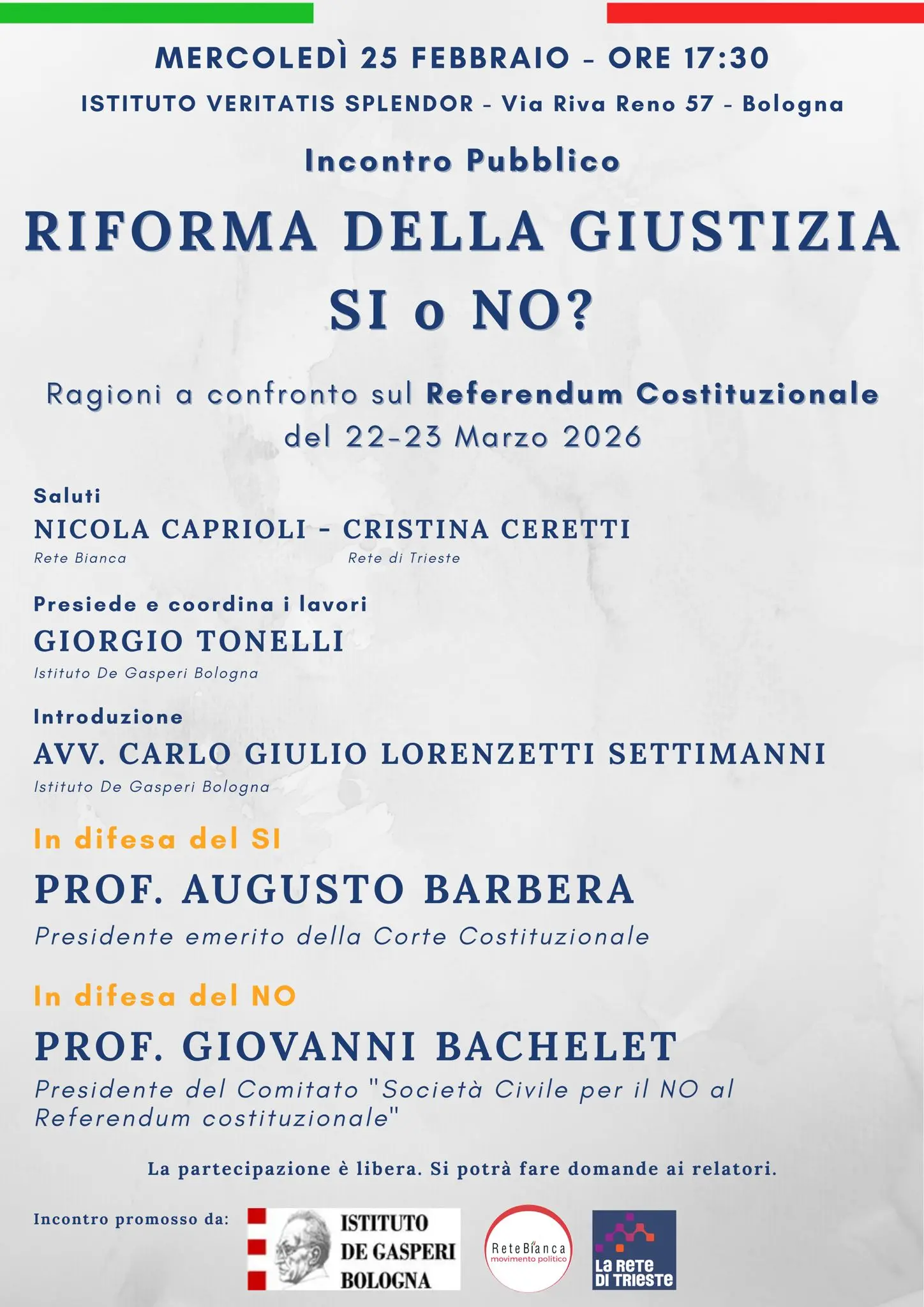 Ragioni a confronto sul Referendum costituzionale sulla riforma Nordio del 22 e 23 marzo. In difesa del Si il professor Augusto Barbera, presidente emerito della Corte Costituzionale. In difesa del No il professor Giovanni Bachelet, presidente del Comitato Società Civile per il No