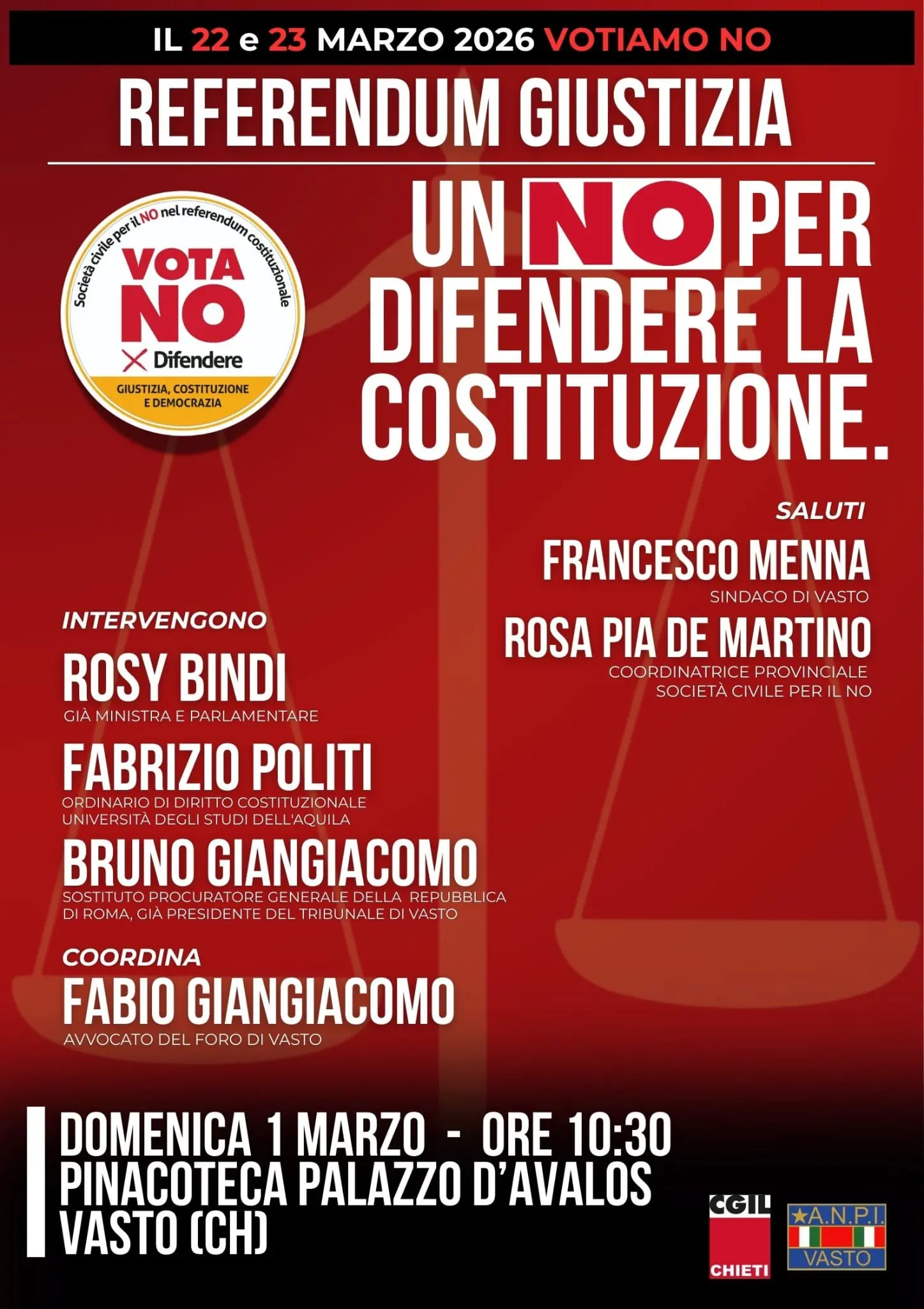 Insieme a Rosy Bindi, Comitato Società Civile per il No, saranno presenti a Chieti in una mattinata dedicata alle ragioni del No al referendum del 22 e 23 marzo sulla riforma Nordio, anche Fabrizio Politi, ordinario di Diritto Costituzionale Università de L’Aquila; Bruno Giangiacomo, sostituto procuratore della Repubblica di Roma; Fabio Giangiacomo, avvocato foro di Vasto