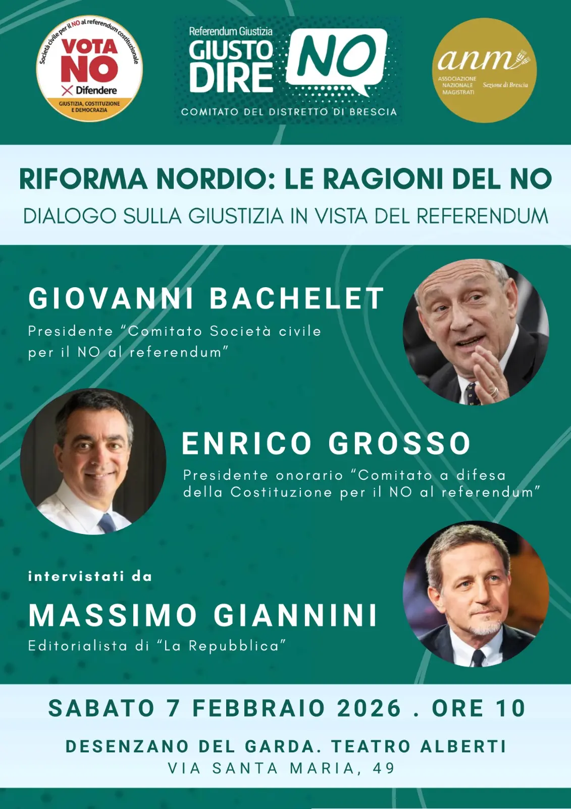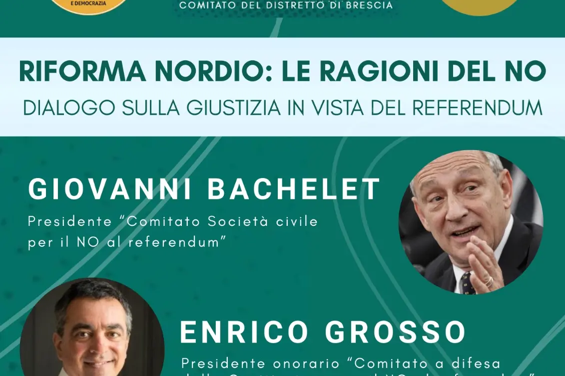 Sabato mattina, a Desenzano sul Garda, Giovanni Bachelet, presidente del Comitato Società Civile per il No, ed Enrico Grosso, presidente del Comitato Giusto dire No, dialogheranno sulla Giustizia. A moderare l'incontro Massimo Giannini, editorialista di La Repubblica