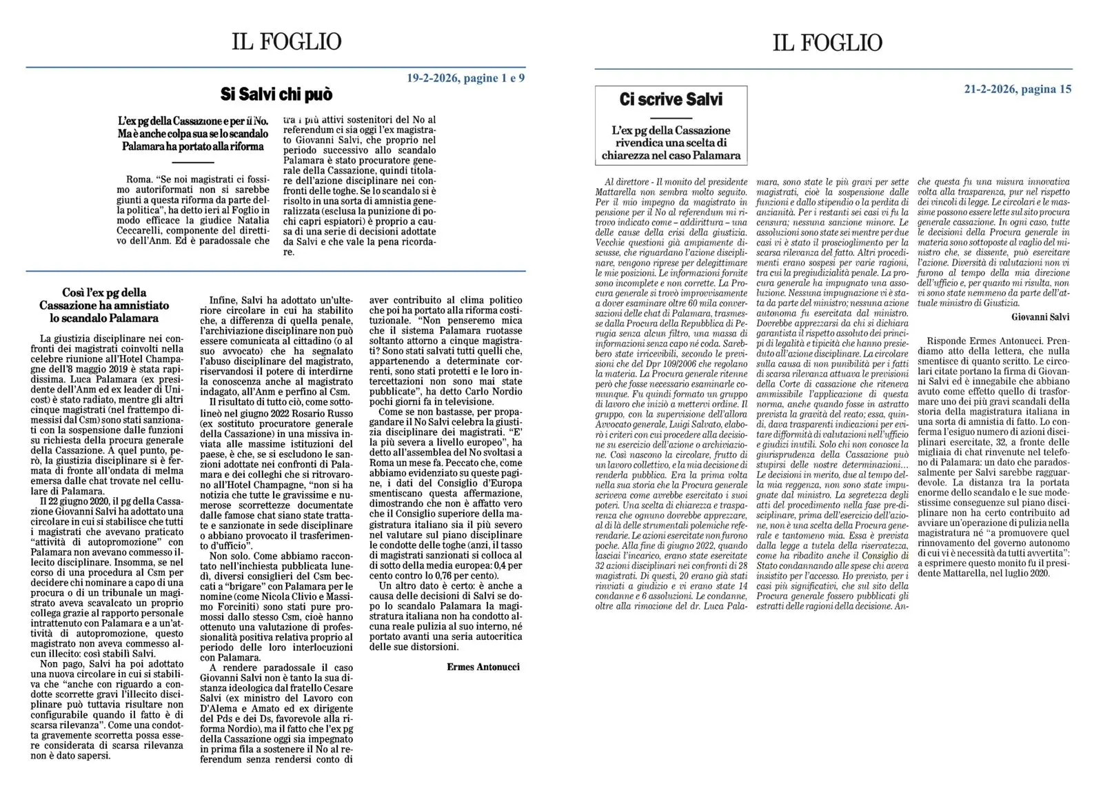 Il Foglio pubblica la risposta di Giovanni Salvi a un articolo di Ermes Antonucci