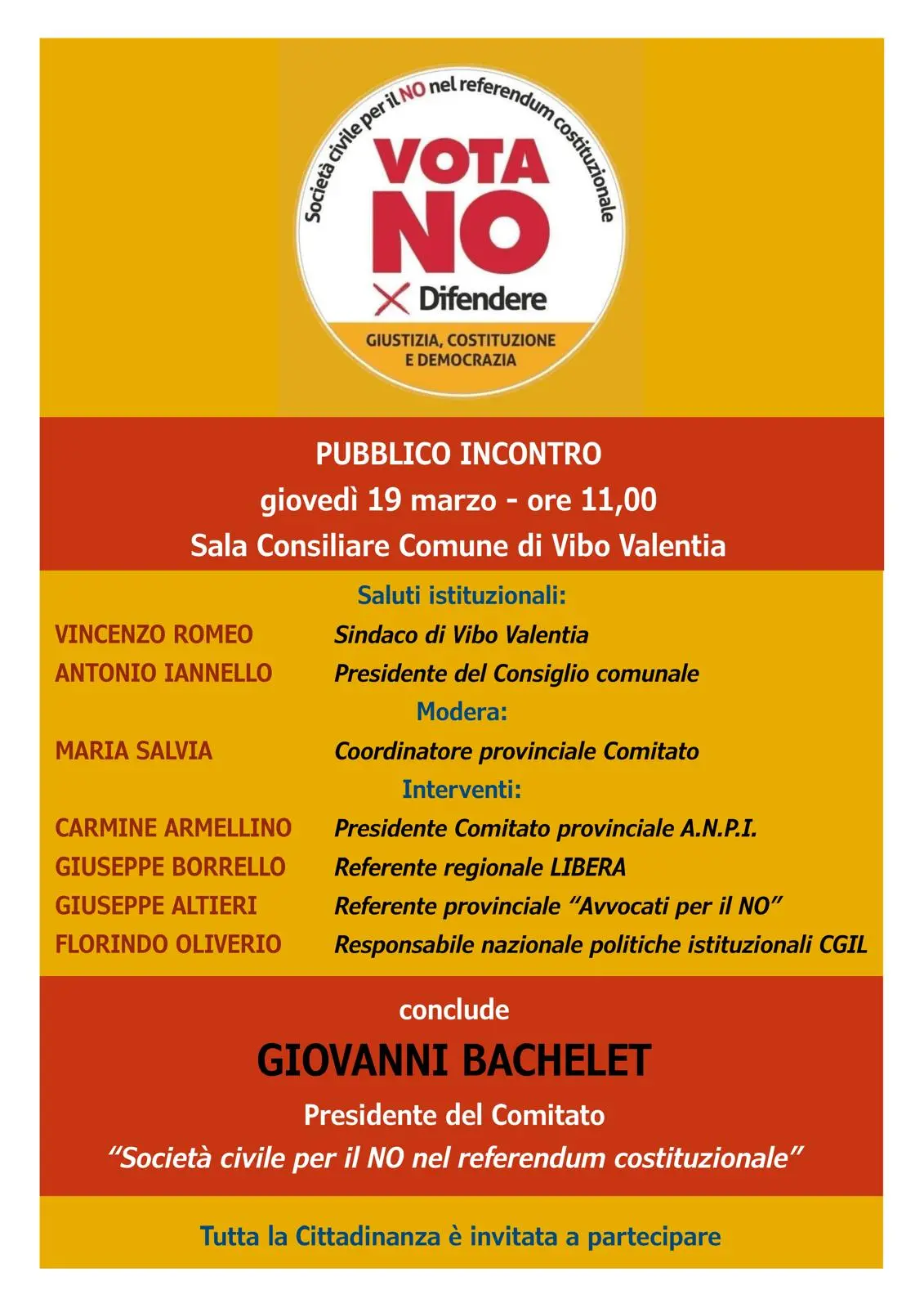 Iniziativa pubblica su perché Votare No al referendum del 22 e 23 marzo con Giovanni Bachelet, presidente del Comitato Società Civile per il No