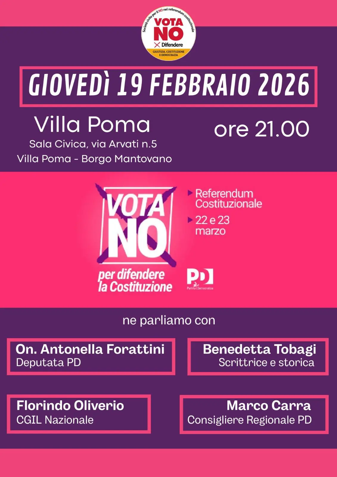 L e ragioni del No al referendum del 22 e 23 marzo sulla Riforma Nordio verranno illustrate, tra gli altri, da Benedetta Tobagi, scrittrice e storica componente del direttivo del Comitato Società Civile per il No; e di Florindo Oliverio, della Cgil Nazionale. L’appuntamento è per le ore 21.oo del 19 febbraio a Borgo Mantovano
