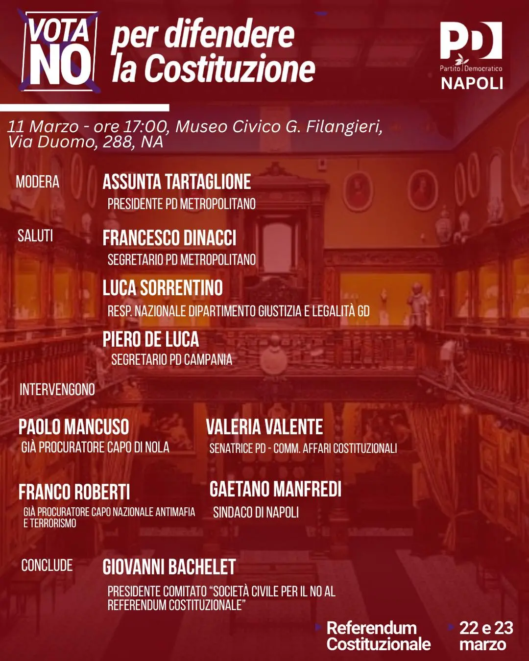 Si annuncia un pomeriggio interessante quello che si terrà al Museo Filangeri a Napoli. In tanti e tante per spiegare perché votare No al referendum del 22 e 23 marzo prossimo: per difendere la Costituzione. Concluderà Giovanni Bachelet, presidente del Comitato Società Civile per il No