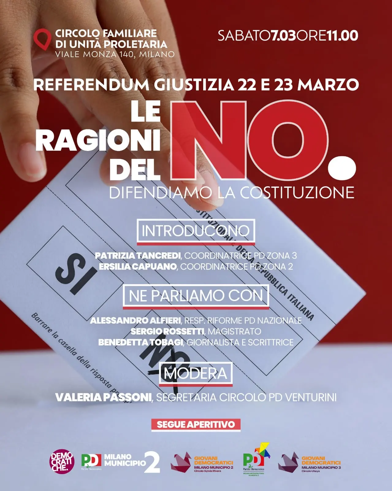 Una mattinata intensa, ospitata nel Circolo Familiare di Unità proletaria a Milano per confrontarsi su un tema delicato: Difendere la Costituzione da qui vuole manometterla con la Riforma Nordio e quindi sulle ragioni del No al referendum del 22 e 23 marzo. Interverrà tra gli altri, Benedetta Tobagi, scrittrice e storica, del Comitato Società Civile per il No