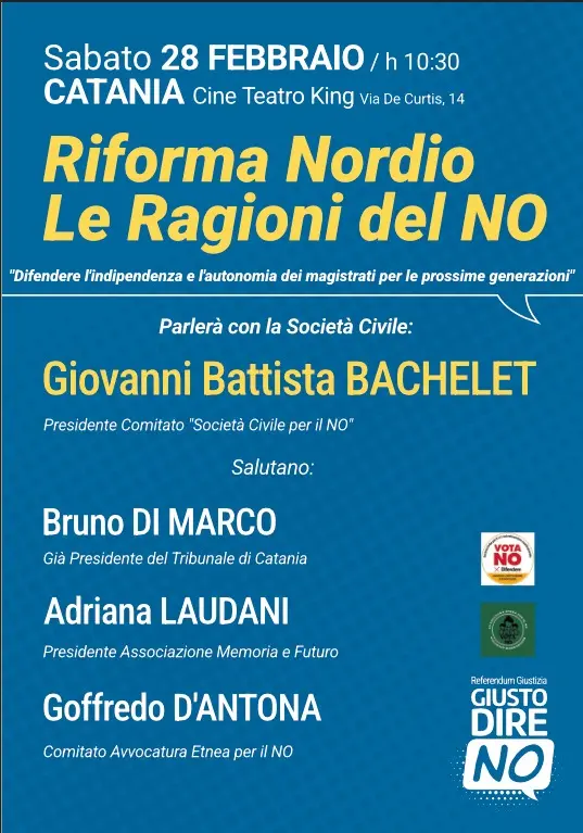 Prima dell’intervento di Giovanni Bachelet, presidente del Comitato Società Civile per il No, interverranno all’incontro pubblico organizzato a Catania per illustrare le ragioni del No al referendum del 22 e 23 marzo sulla riforma Nordio, Bruno Di Marco, già presidente del Tribunale di Catania; Adriana Laudani, presidente dell’Associazione Memoria e futuro; Goffredo D’Antona, presidente Comitato avvocatura etnea per il No